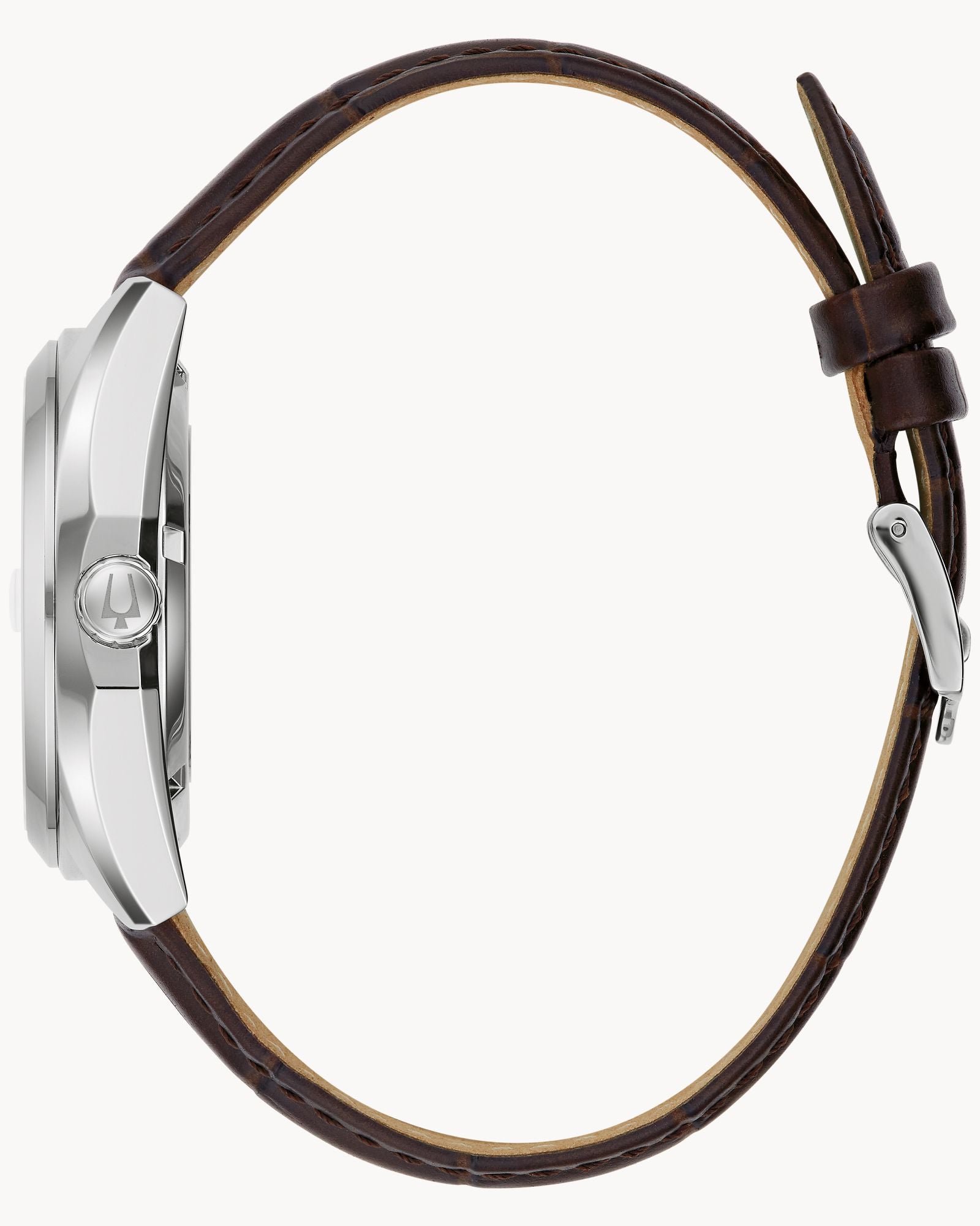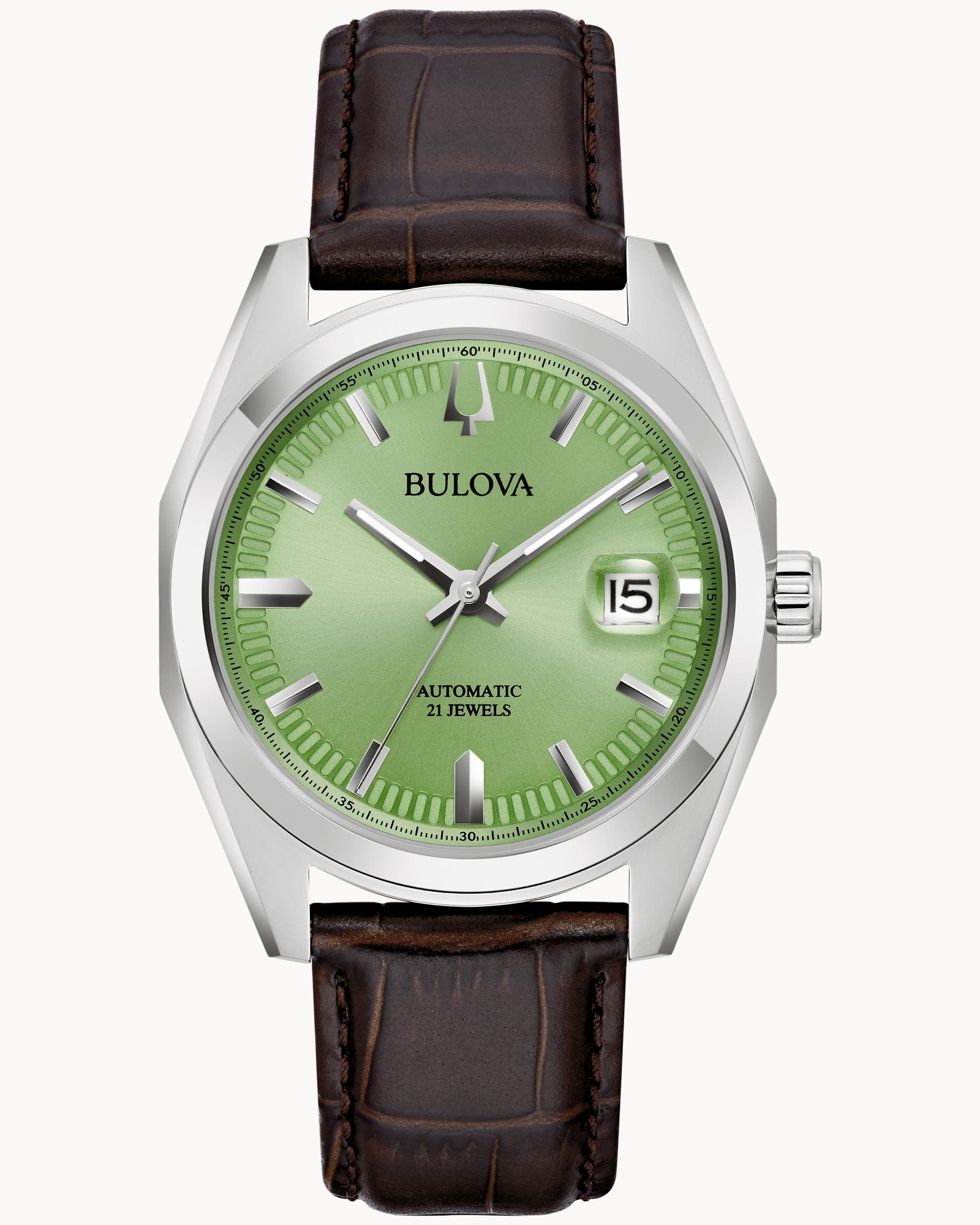 Bulova 96B427 de la colección Surveyor es un reloj automático que combina elegancia contemporánea con mecánica tradicional. Su esfera verde con acabado tipo rayos de sol aporta un carácter distintivo, mientras que sus manecillas luminiscentes y marcadores en relieve garantizan excelente legibilidad.