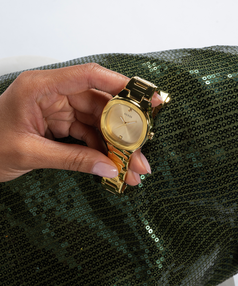 El GUESS GW0615L2 es un reloj femenino con una estética elegante y moderna. Su caja de acero inoxidable en tono dorado de 32 mm combina con una esfera champagne lisa, donde destacan tachuelas (“studs”) en las posiciones de las 12 y las 6. El brazalete también es de acero dorado con eslabones pulidos, lo que le da durabilidad y brillo. Cuenta con movimiento de cuarzo para una medición confiable del tiempo y vidrio mineral resistente. Con resistencia al agua de hasta 30 metros, es adecuado para uso diario y preparado para salpicaduras.
