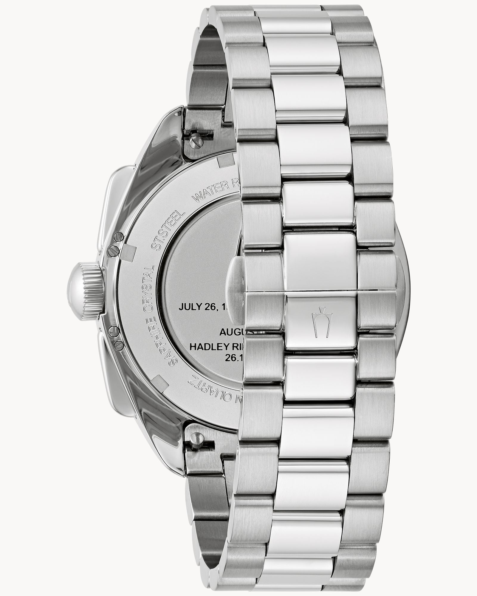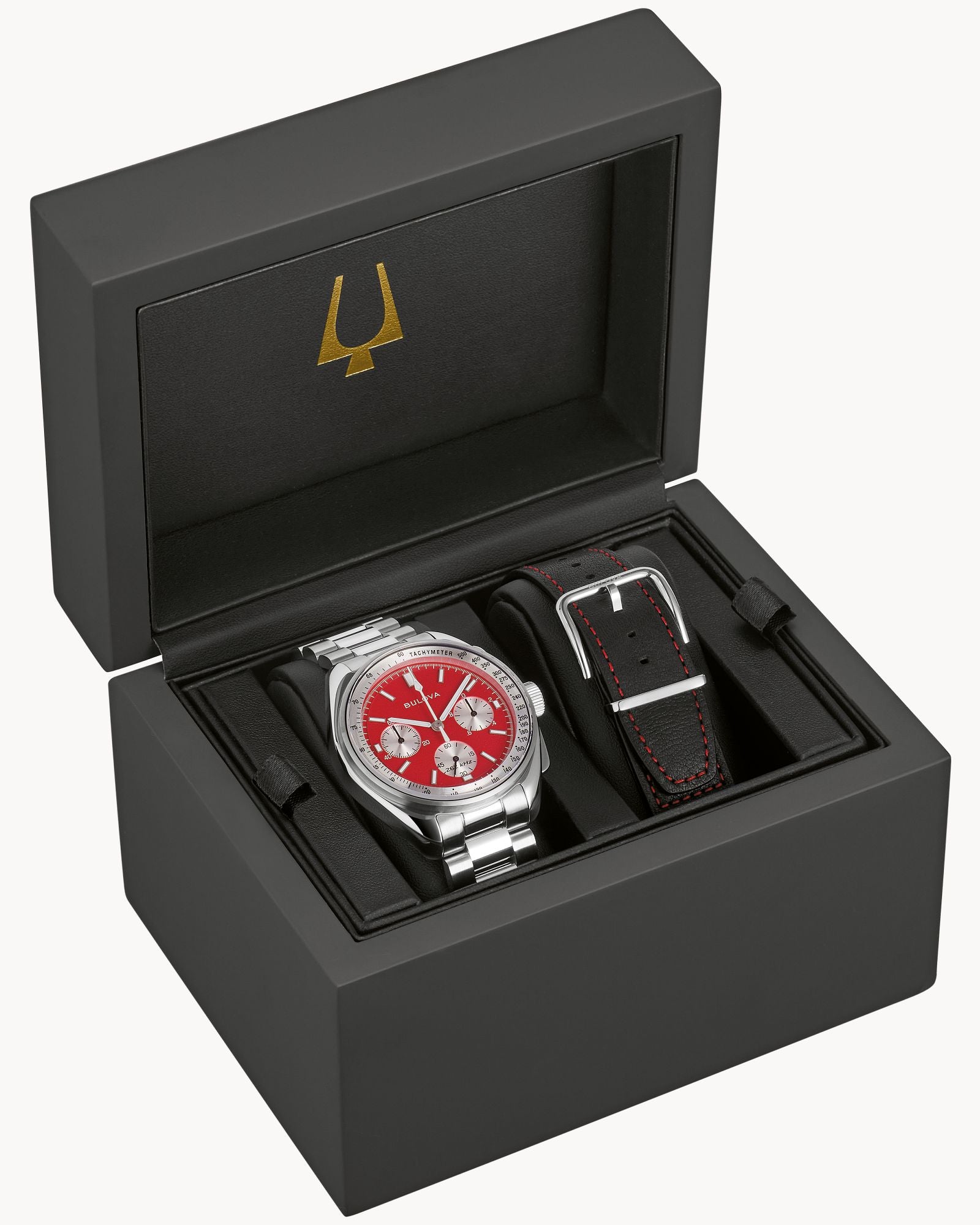 El Bulova 96K115 – Lunar Pilot “Blood Moon” es un cronógrafo de la serie Archive / Histórico, que rinde homenaje al cronógrafo Bulova utilizado durante la misión Apolo 15. Equipa un movimiento HPQ (High Performance Quartz) de 262 kHz, que ofrece una precisión extraordinaria y un segundero de barrido suave. Su diseño combina la historia espacial con detalles contemporáneos: cuenta con una esfera roja vibrante (“Blood Moon”), tres subesferas plateadas estilo “panda”, y un taquímetro para mediciones de velocidad.