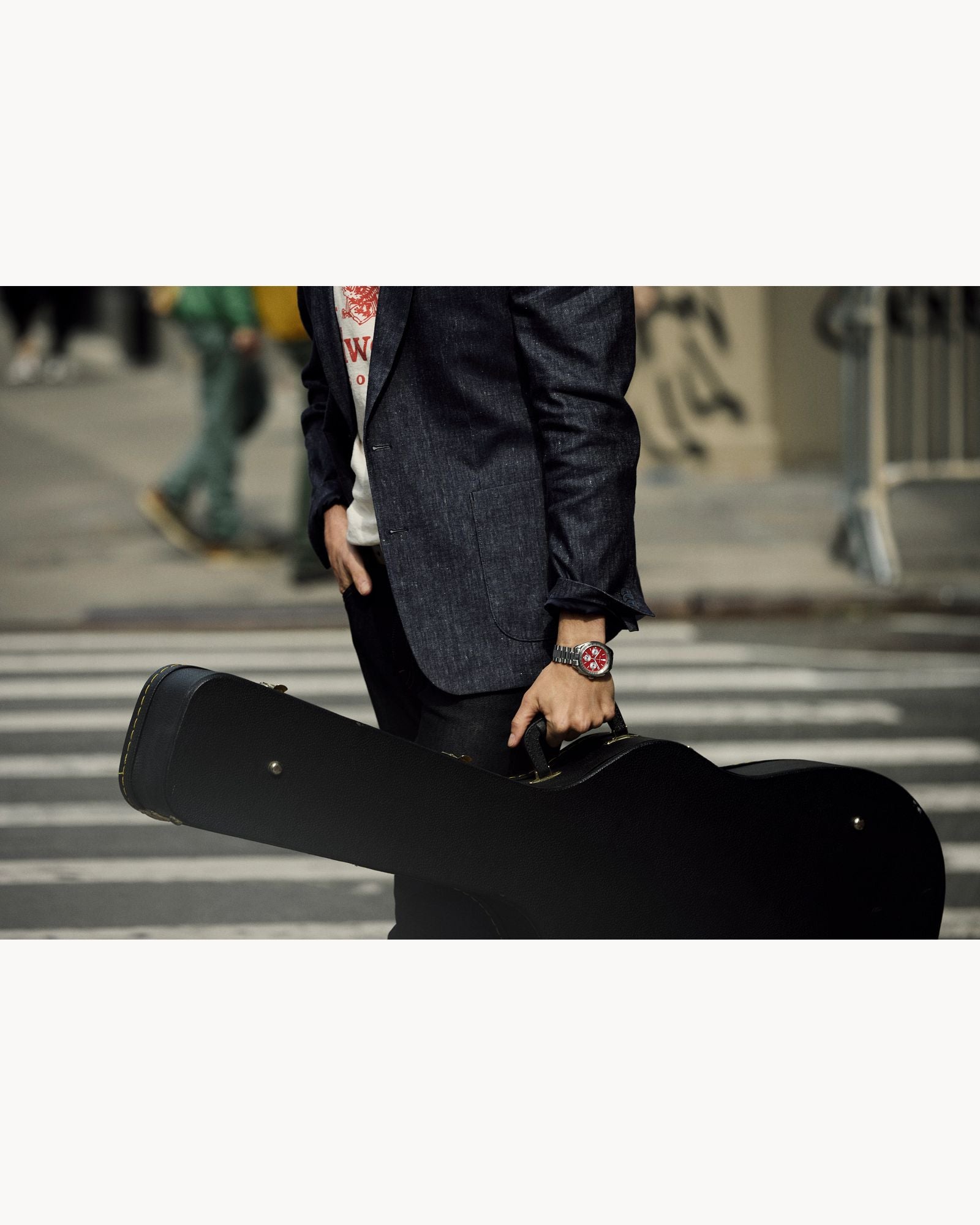 Además del brazalete de acero inoxidable de tres eslabones, el reloj incluye una correa de piel negra estilo NATO con costuras rojas (fácil de intercambiar), lo que añade versatilidad y carácter. El cristal es de zafiro con tratamiento antirreflectante, y su fondo de caja está asegurado con rosca. Ofrece resistencia al agua hasta 50 metros, haciéndolo adecuado para el uso diario sin sacrificar su herencia espacial.