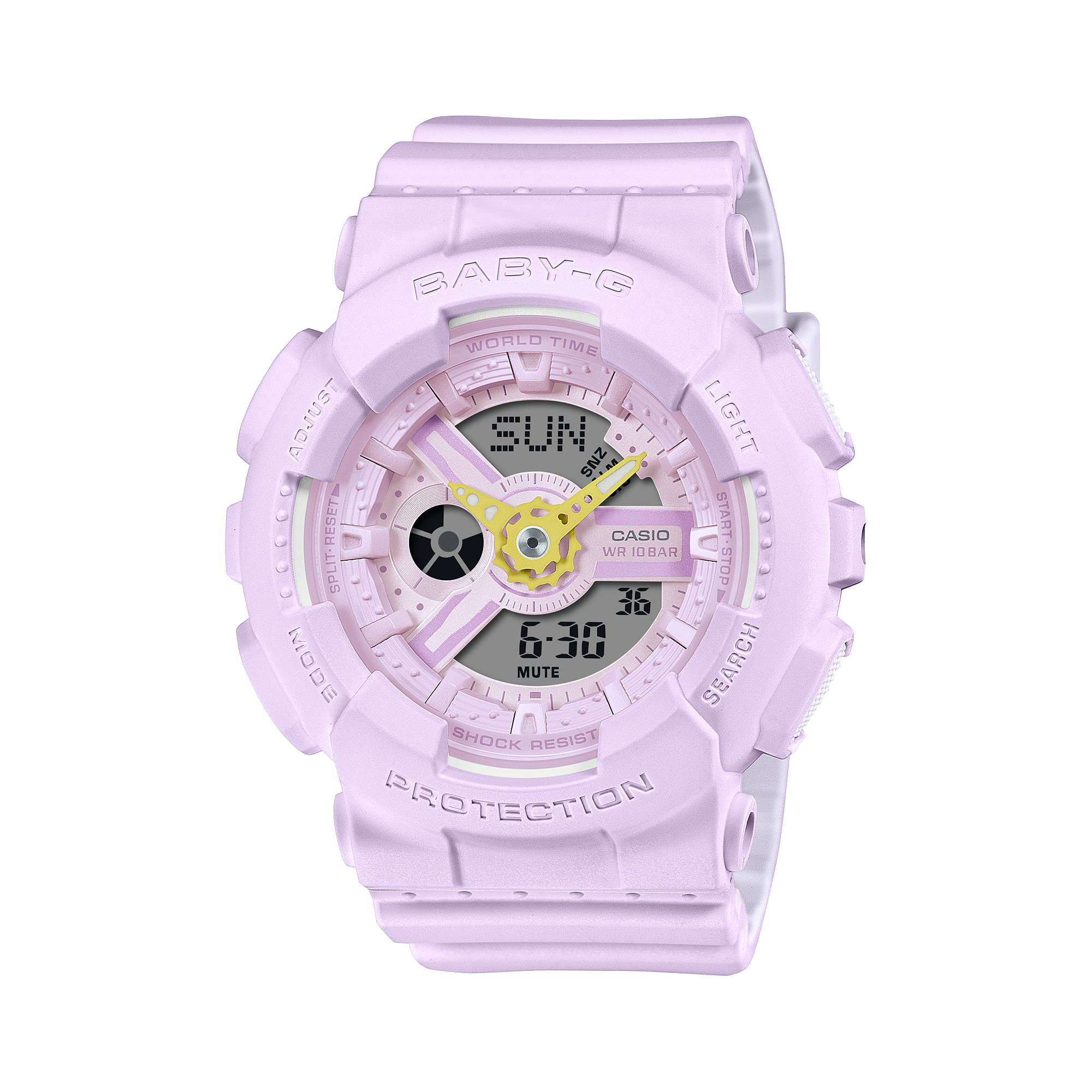 Este reloj une estilo urbano y energía vibrante con la serie BA-110AH. El BA-110AH-6A presenta un elegante diseño en tonos lavanda / malva con detalles en colores contrastantes en las manecillas, aportando un acento llamativo.