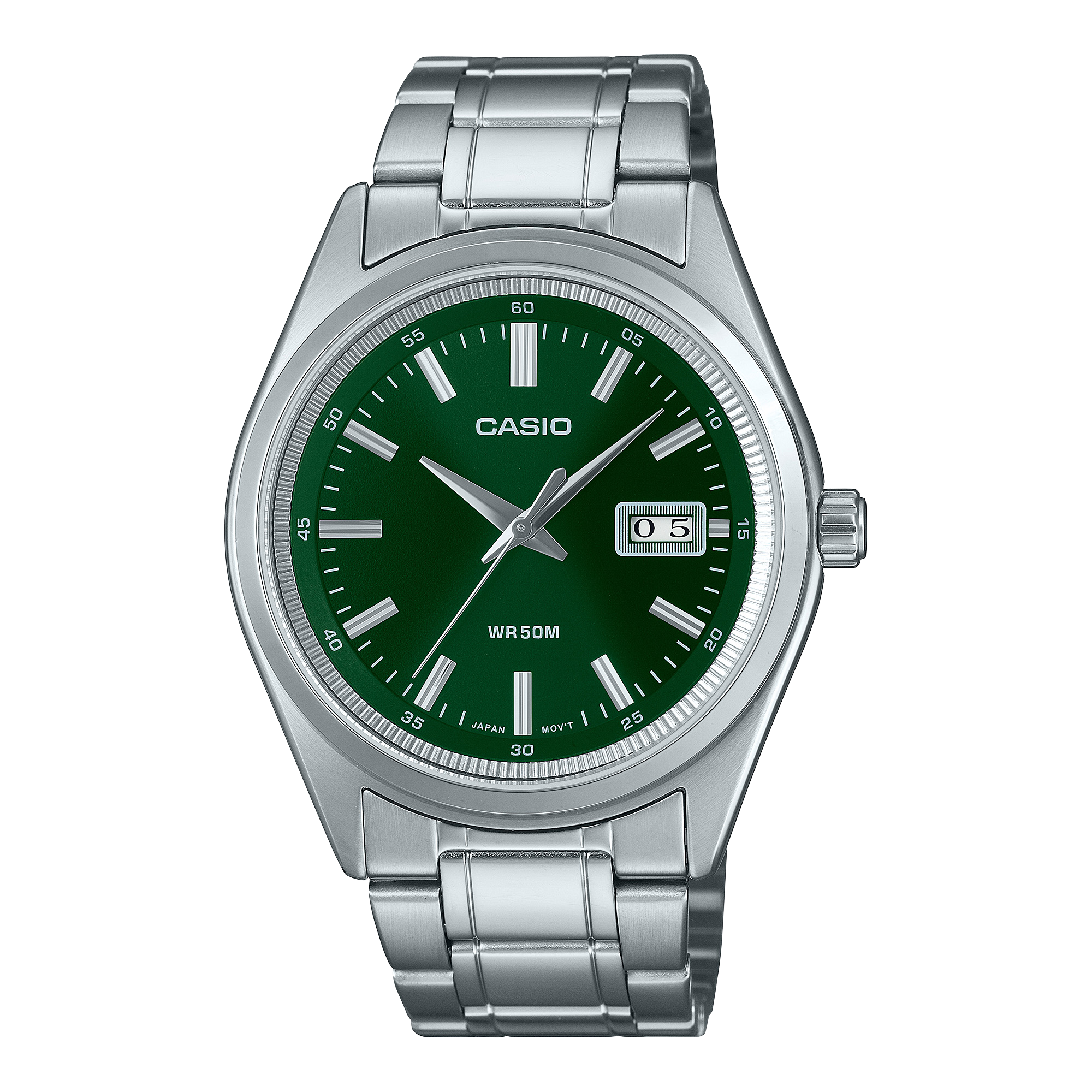 El MTP-B180D-3AV destaca por su estilo audaz y funcionalidad confiable. Su resistencia al agua de 100 m permite usarlo en actividades acuáticas ligeras, mientras que el bisel con diseño de engranaje aporta un aire técnico y resistente. Los detalles en verde metálico realzan su estética moderna sin perder sobriedad, y su construcción en acero inoxidable asegura durabilidad y confort. Un reloj ideal para quienes buscan un modelo sólido, preciso y con la calidad distintiva de Casio.