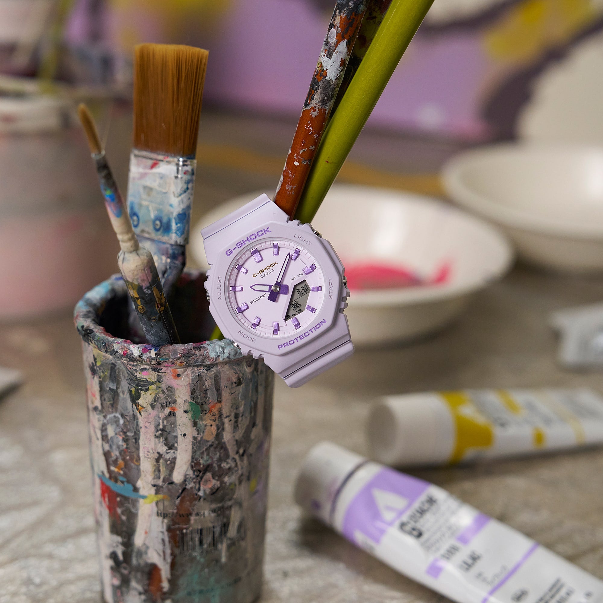 El GMA-P2125W-6A de la serie G-SHOCK “2100” ha sido diseñado para muñecas más pequeñas sin renunciar a la robustez característica de la marca. Presenta un diseño en tono púrpura suave con acentos blancos y dorados que añaden un toque femenino y moderno. Los componentes clave de caja y correa están fabricados en resina de origen bio-basado, lo que reduce el impacto ambiental. Con resistencia a impactos, agua hasta 200 metros y una estructura compacta, este reloj combina estilo, funcionalidad y conciencia ecológica.